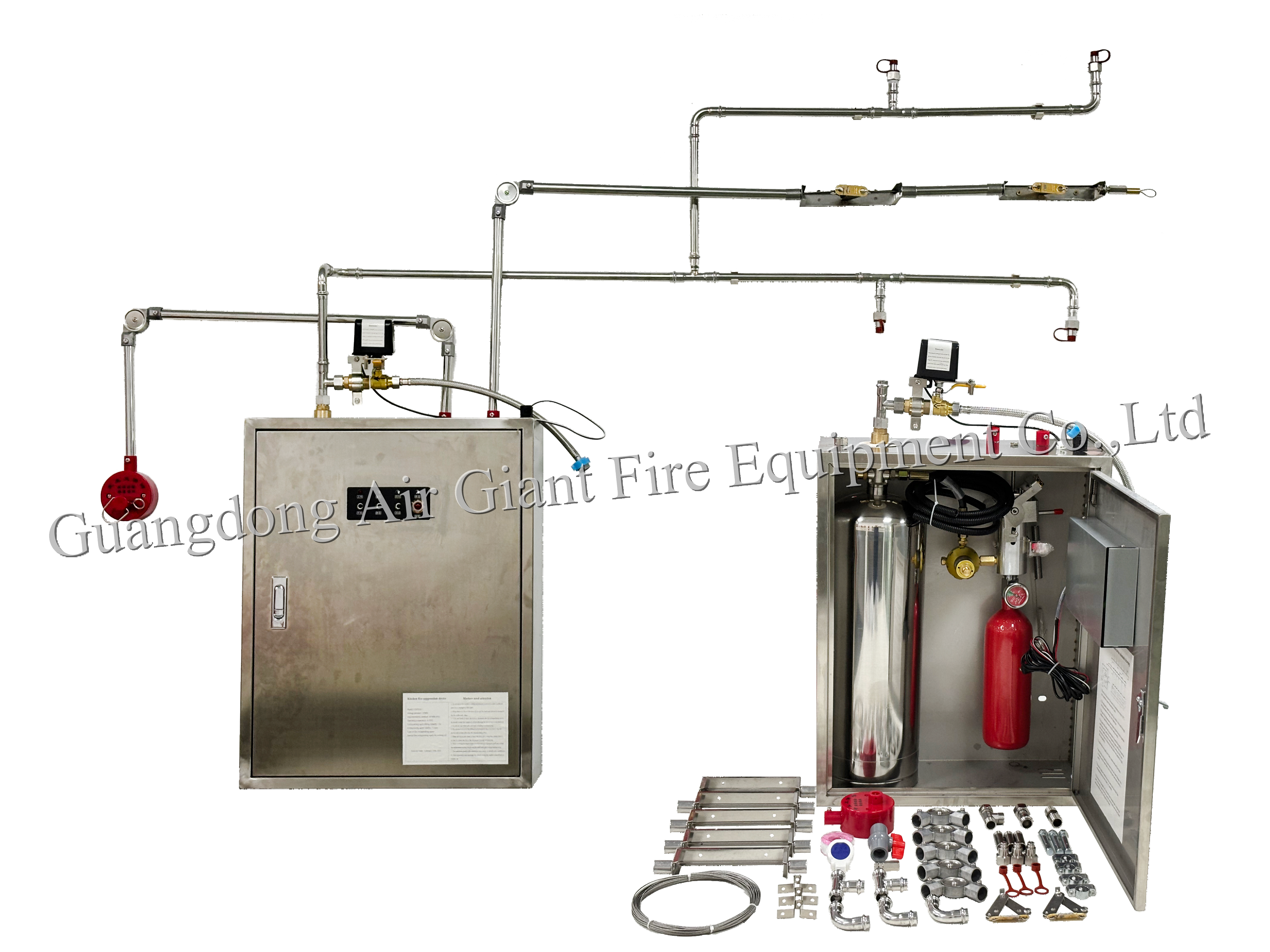 De brandblusapparatuur voor keukenapparatuur is een complete reeks apparaten die worden geïnstalleerd in omgevingen met een hoge luchtvochtigheid en hitte, zoals industriële keukens, commerciële keukens en civiele keukens.met inbegrip van: