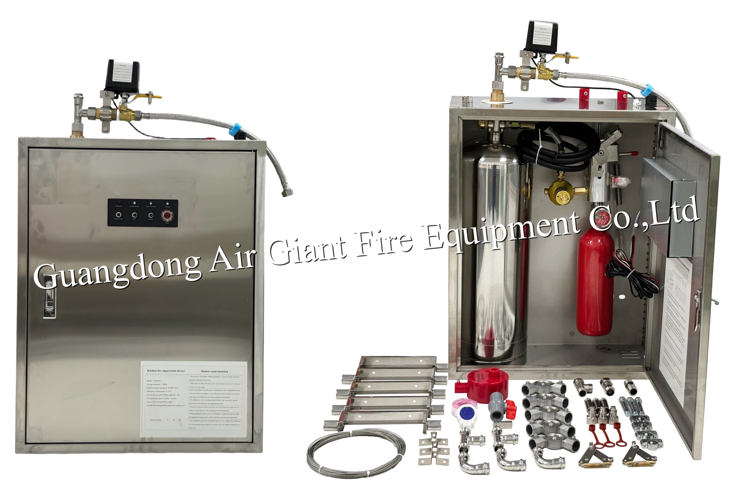 2. Tipe brandblusmiddel: Sommige brandblussystemen in de keuken gebruiken gas onder hoge druk om het brandblusmiddel aan te drijven.een mechanische actuator doorborst de hogedrukgascilinderHet gas komt vervolgens in de bovenkant van de brandblusschijf.het middel door de afvoerbuizen naar de sproeiers duwen voor het sproeien.