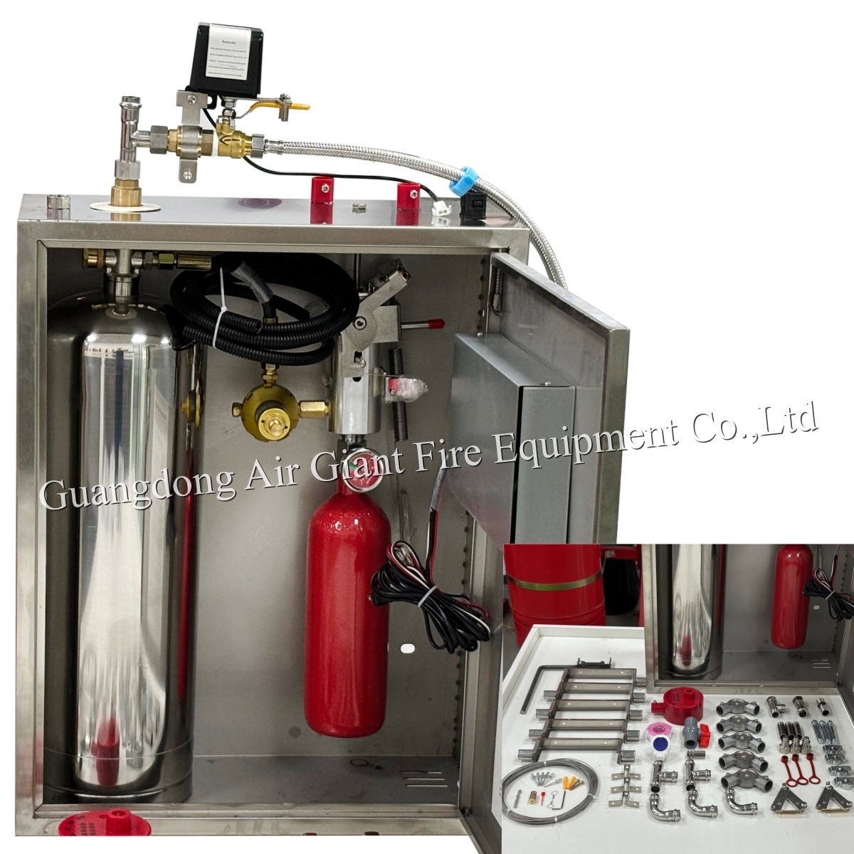 De brandblusapparatuur voor keukenapparatuur is een complete reeks apparaten die worden geïnstalleerd in omgevingen met hoge luchtvochtigheid en hitte, zoals industriële keukens, commerciële keukens en civiele keukens.met inbegrip van:
